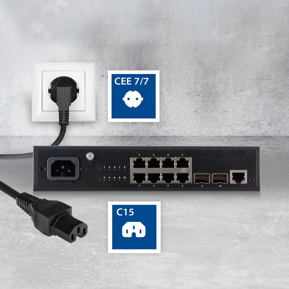 Apparatsladdställ med vinklad schuko till C15 är utformad för att driva nätverksswitchar, servrar och annan professionell IT-utrustning. C15-kontakten är värmetålig upp till 120 °C, vilket gör kabeln till ett pålitligt val i krävande miljöer. Används för att driva nätverksswitchar från de vanligaste varumärkena på marknaden HP och Cisco mm.