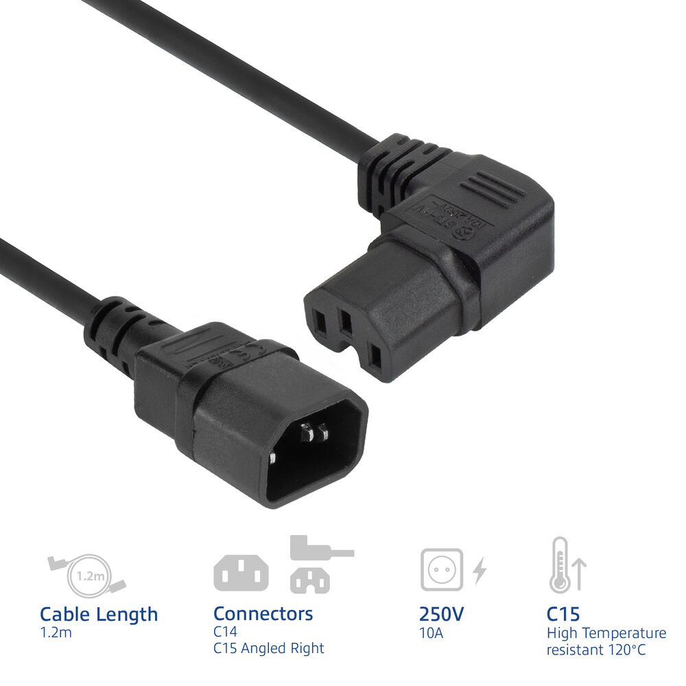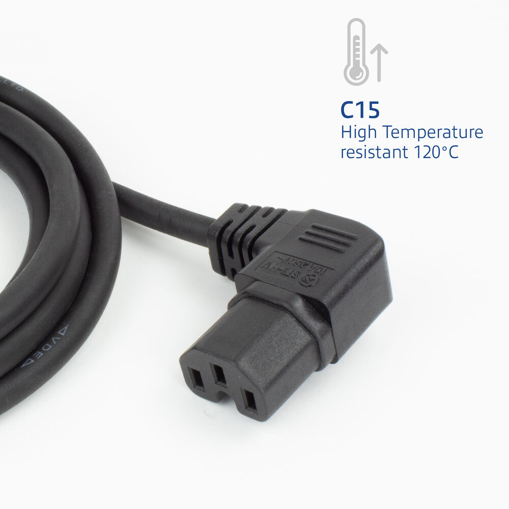 IEC 60320-strömkabel med C14 till C15-anslutning är utformad för att driva nätverksswitchar, servrar och annan professionell IT-utrustning. C15-kontakten är vinklad höger och är värmetålig upp till 120 °C, vilket gör kabeln till ett pålitligt val i krävande miljöer. Lämplig för servrar och nätverksswitchar, t.ex. HP och Cisco.