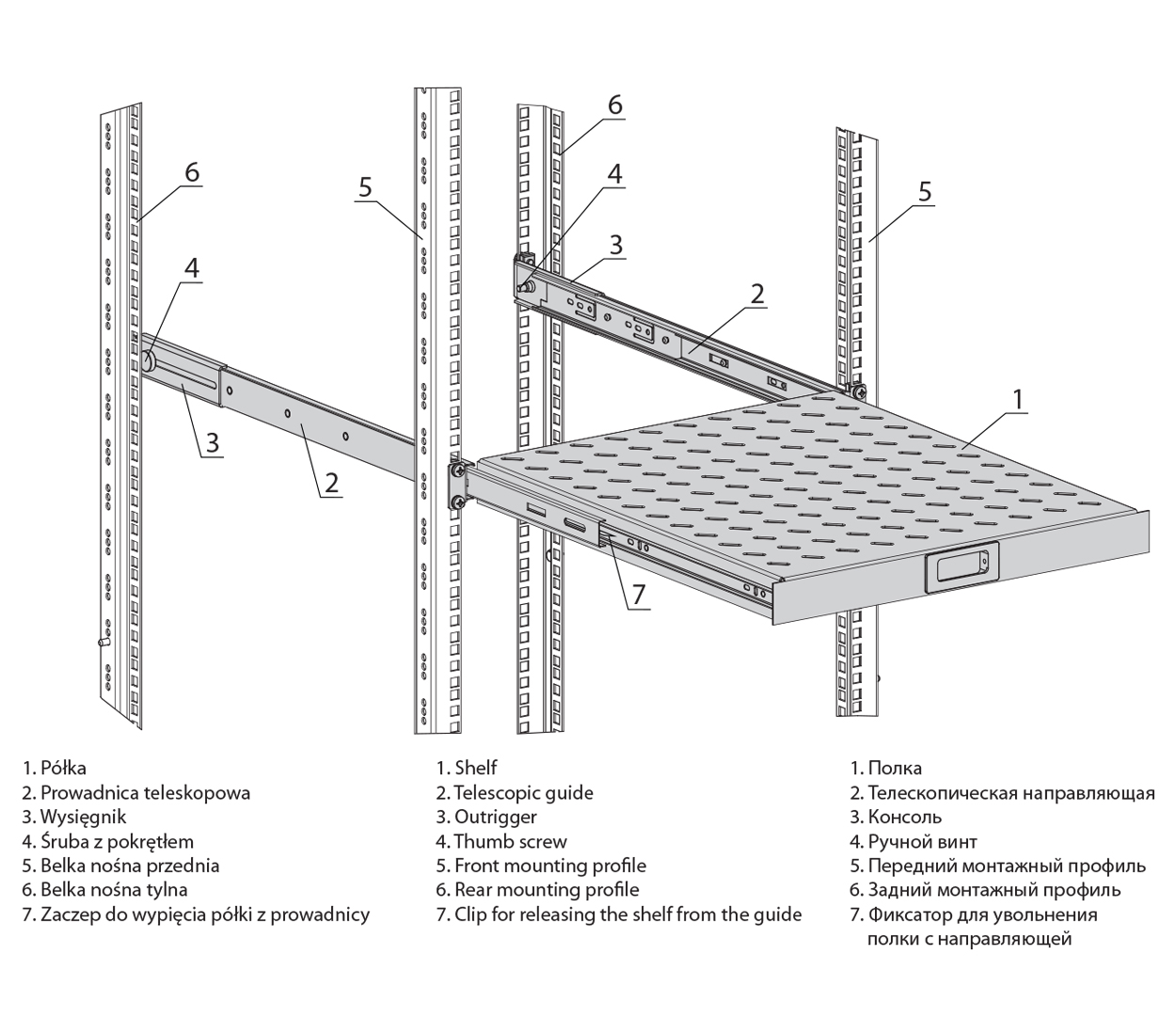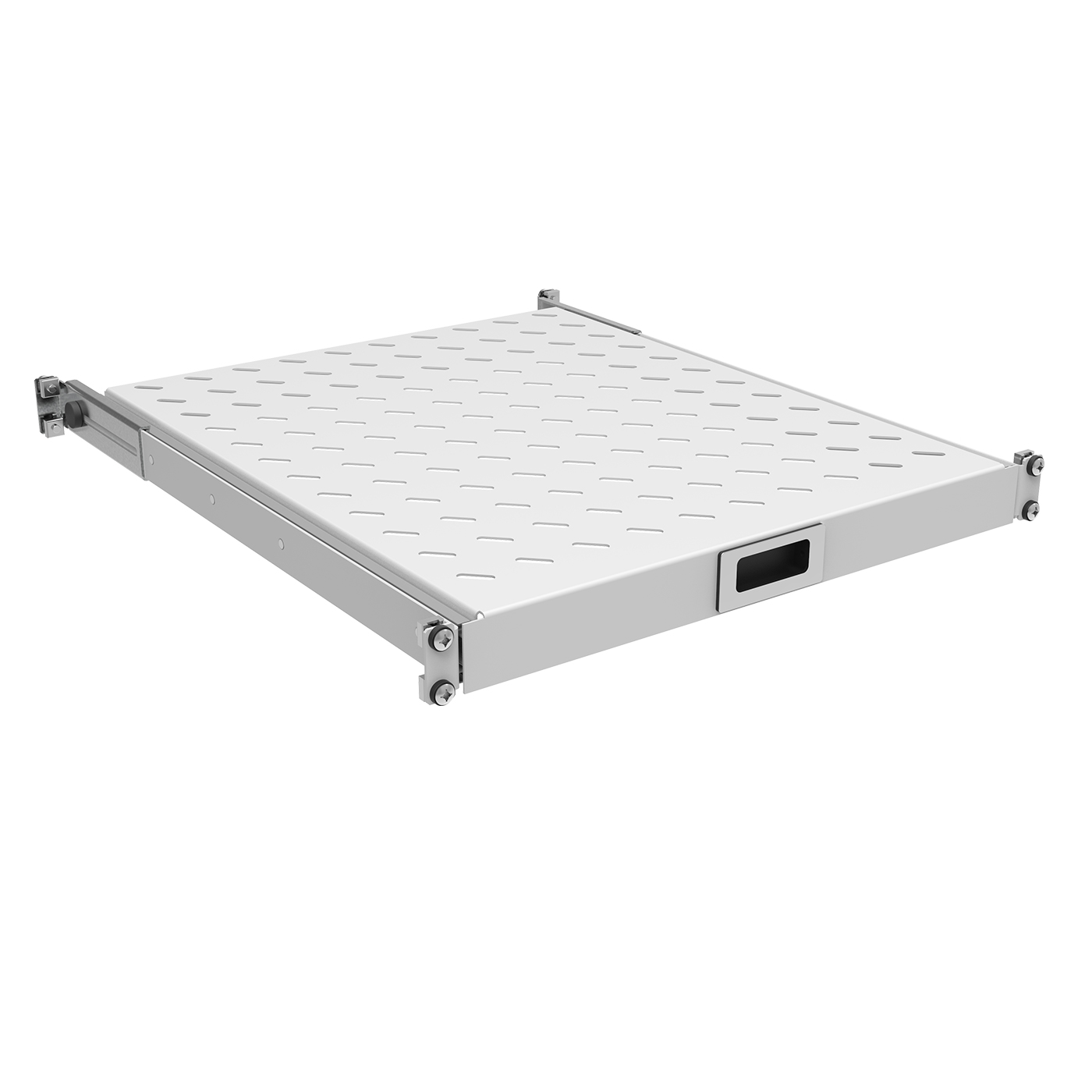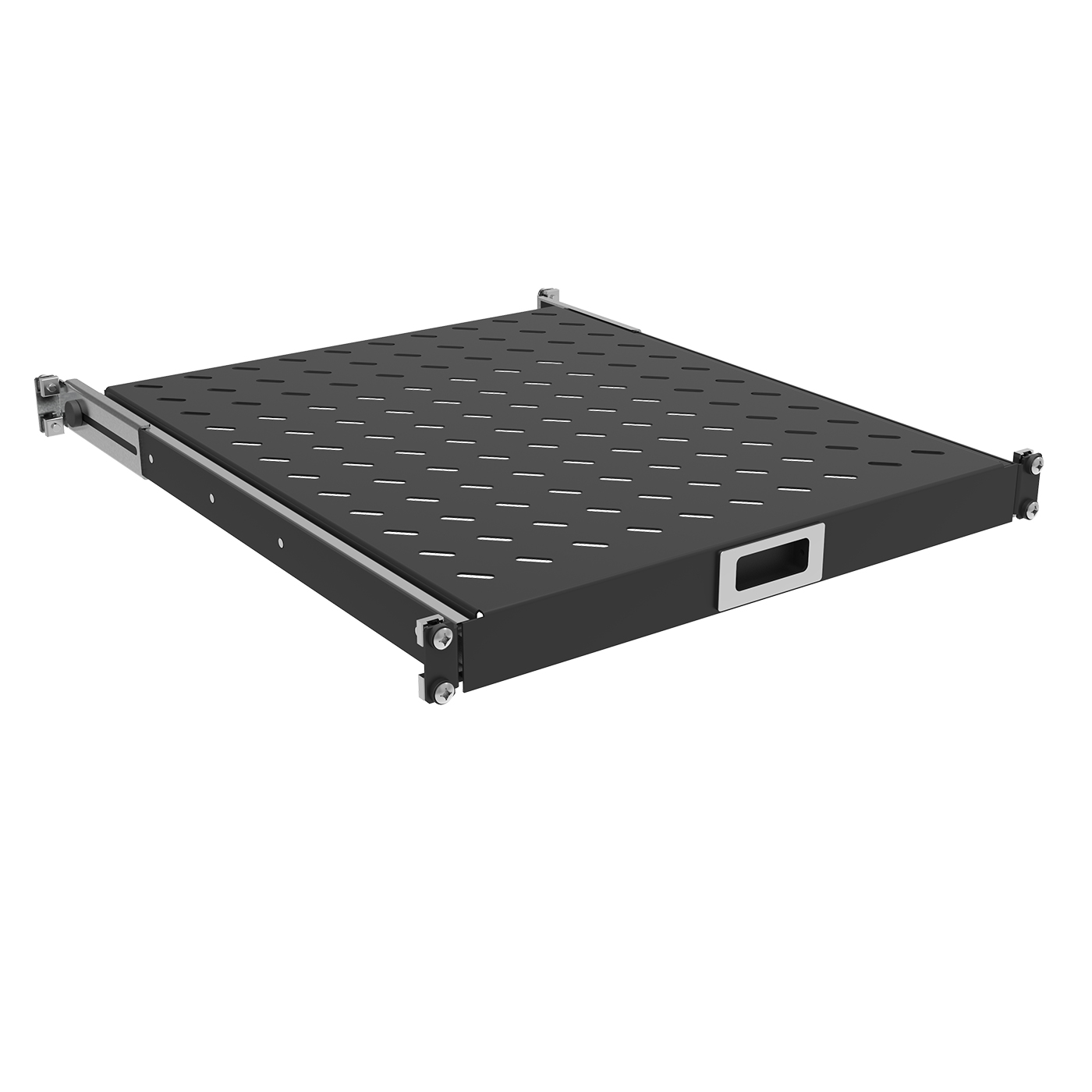 19 tum utdragbar rackhylla som fästs i fram och bakkant, de bakre fästpunkterna är justerbara i djupled 100mm. Avställningsytan är ventilerad.