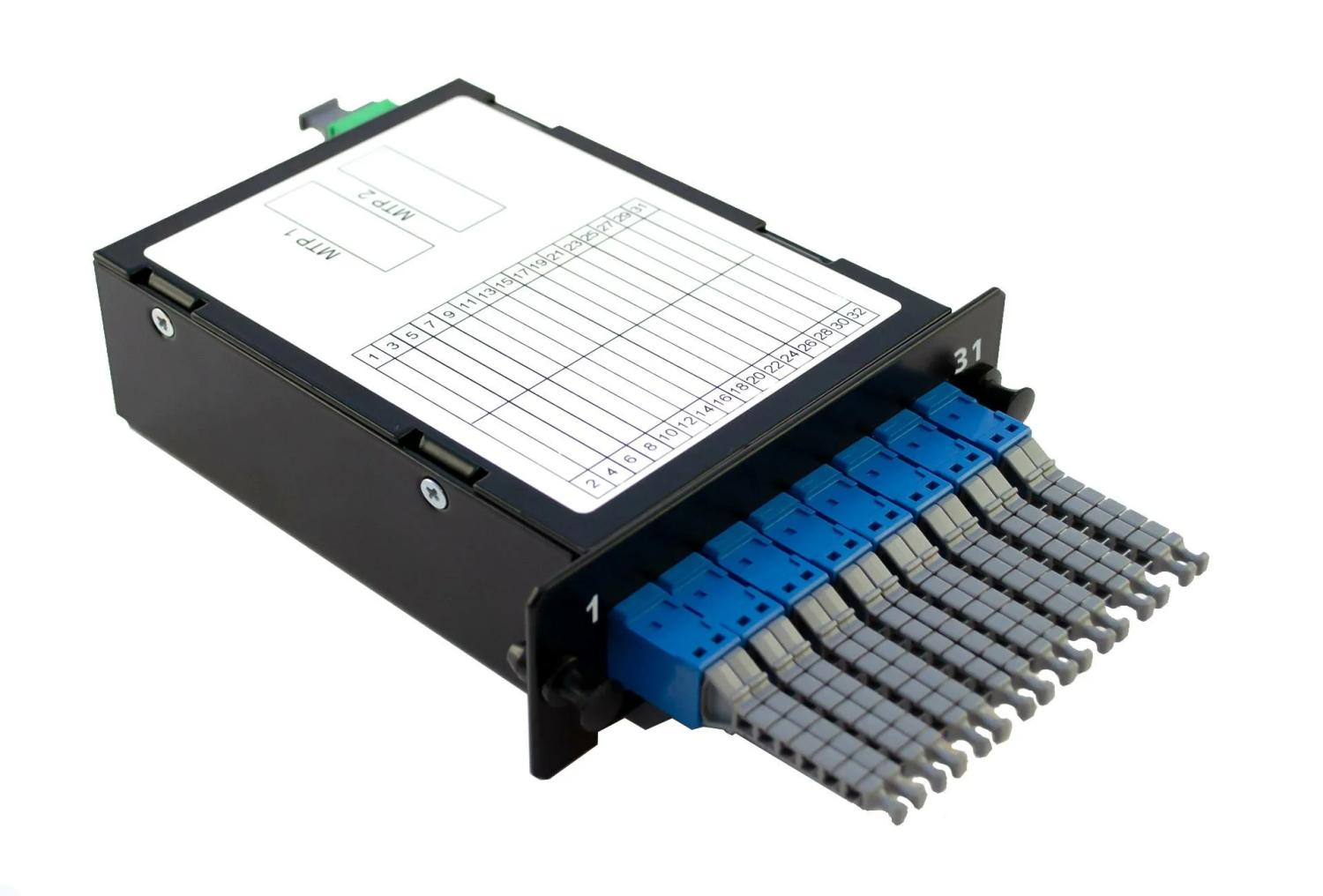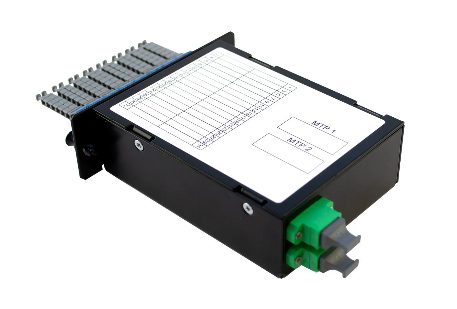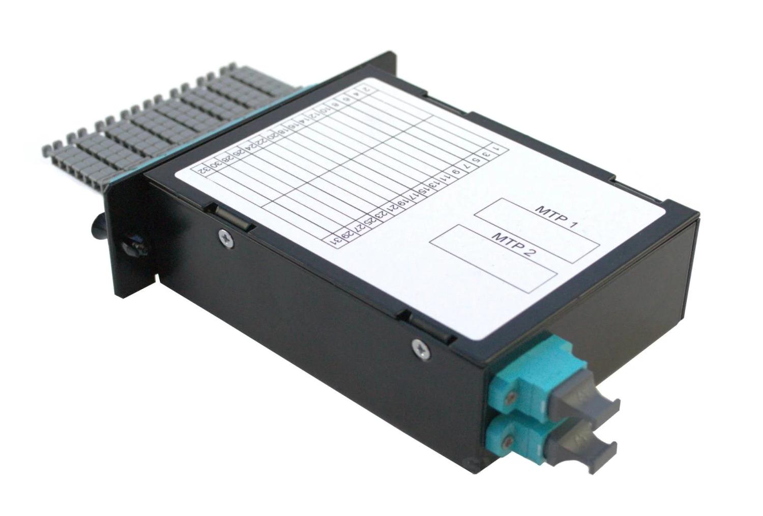 Plug & Play M4 MTP/MPO kassett med totalt 32 MDC anslutningar (2 x 16F MTP i bakkant, MTP är US Conec modell av MPO-kontakten). Används som delningspunkt för backbone 16F MTP-kabel till 32×MDC-portar i datacenter. OM3, OM4, OM5 multimode, OS2 UPC eller APC singlemode. Finns som rak POL A (standard) eller korsad POL B. Med eller utan Guide pins på MTP kontakten (Hane, med guide pins som standard). Passar i patchpanel M4 1U.