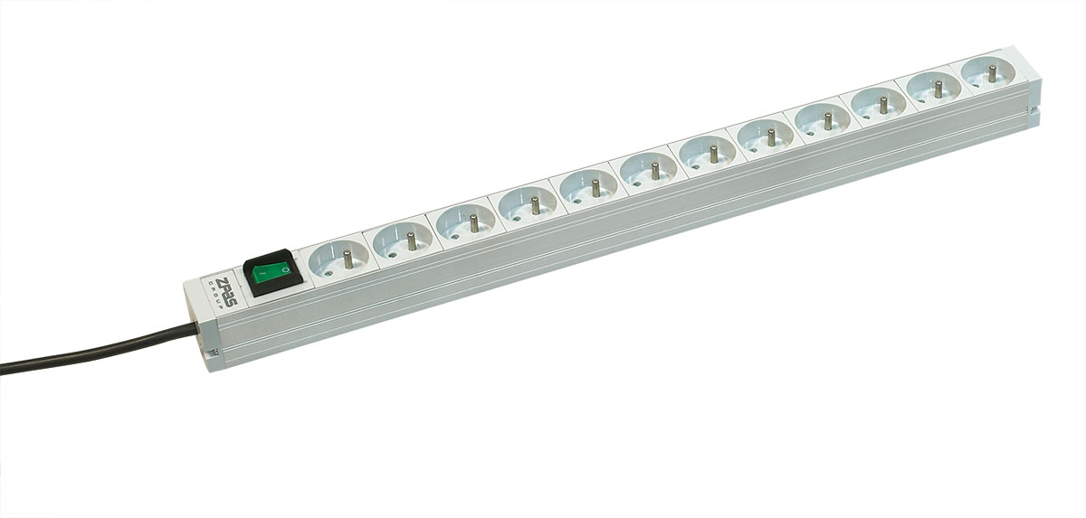 PDU strömlist med 12st shuko uttag och vinklar för vertikalt montage. Upplyst brytare. Kabel med schuko stickpropp. Skruv, korgmutter och plastbricka ingår.