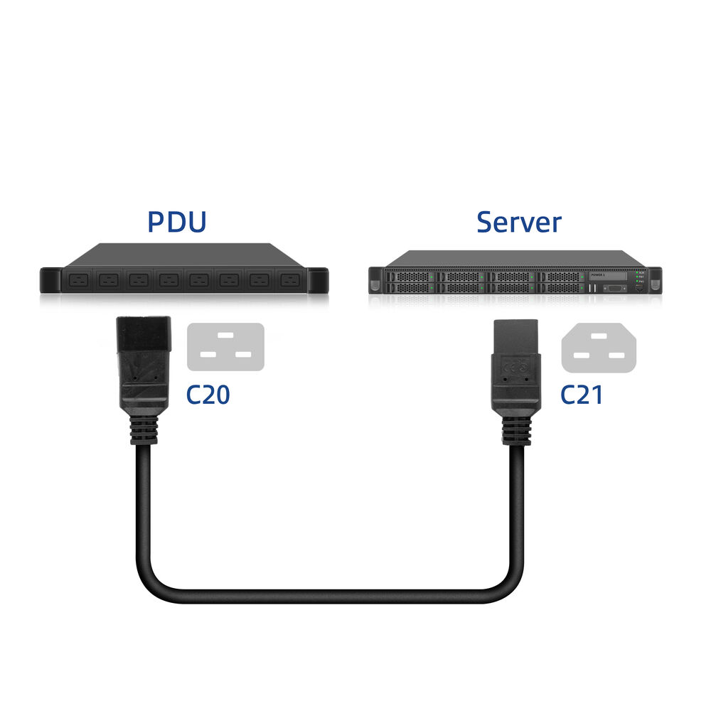 C20 till C21 strömkabel används för att driva högprestandautrustning, exempelvis servrar från de mest använda märkena som HP och Cisco. C21-kontakten är värmebeständig upp till 155 °C, vilket gör kabeln särskilt lämplig för krävande miljöer.